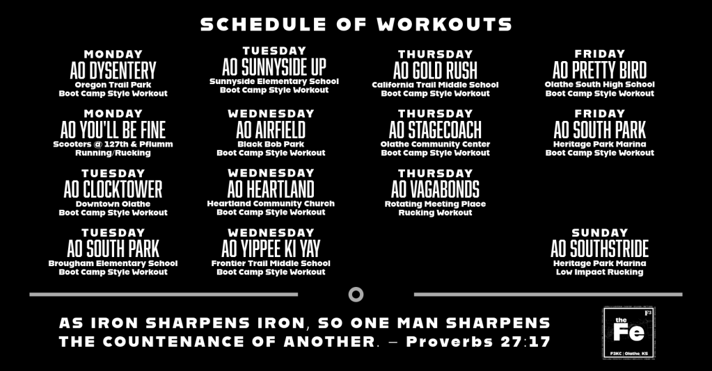 We currently have workouts almost every day of the week. Check the schedule for more information and locations.
